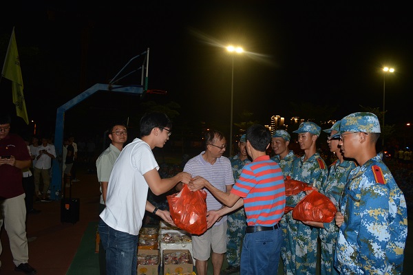 2019年9月12日晚19:30,3044am永利集团学院领导到军训现场慰问教官及新生。出席活动的领导和老师有:学院经理翁绍捷、党委书记黄国标、学工办主任崔建兵、辅导员张小其、黎航、章梦琪、班主任吴京锦,员工党建联席会及各员工支部党员。院领导带来了月饼、水果等慰问品,为军训中的新生们带来一抹清凉。