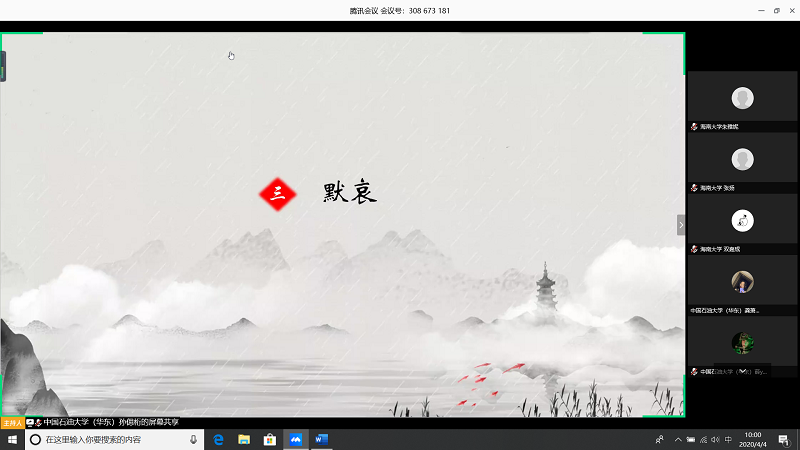 会上,由甘肃农业大学王志文同学带我们回顾疫情,虽然国内疫情已经有所缓解但是同学们还是不能放松警惕;中国石油大学(华东)张子琦同学带领大家向抗疫英雄致敬,十点开始全体起立默哀三分钟;永利集团朱雅妮为大家强调线上上课等同于课堂教学,在家学习不能懈怠,合理规划疫情期间的学习和课程安排。