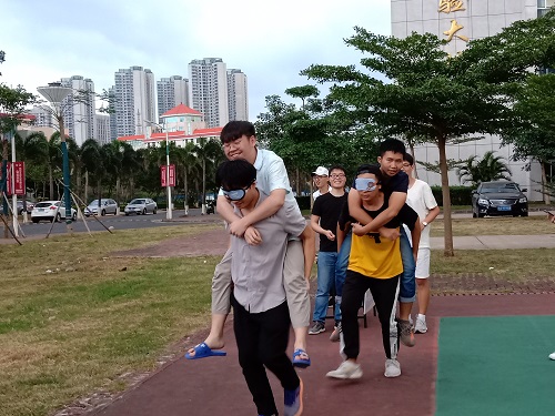 趣味活动正式拉开序幕。本次活动总共设置了七个趣味游戏;萝卜蹲、正话反说、夹乒乓球、吹气球、盲人背瘸子、踩气球、背对背运球等等。在众多的项目中,最难的项目莫过于夹乒乓球,因为只要稍不留神,乒乓球便被风带走了,吹走了球留下来人,而留下的参赛同学只能风中凌乱。而盲人背瘸子的活动也同样给大家带了无尽的欢乐,有人直达终点,也有人偏离轨道,但不变的是那阵阵笑语、欢呼雀跃。活动正如火如荼地进行着,可惜天公不作美,瓢泼大雨仅用几秒就占据了我们的游戏场地,尽管如此,还是有一组同学坚持完成了他们“萝卜蹲”的游戏,最终如愿以偿地拿到了他们的奖励。