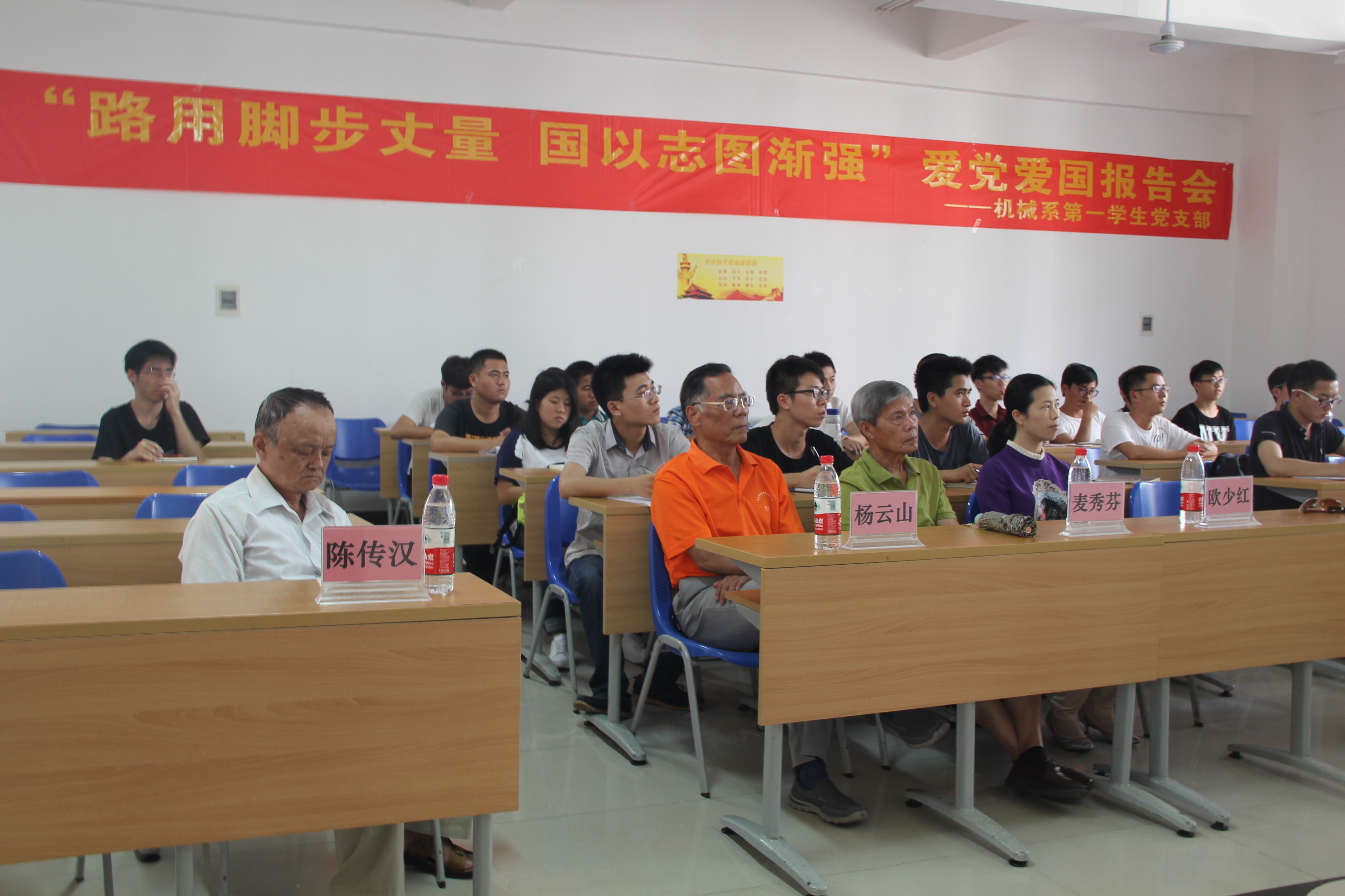 为了积极响应党中央“学党章党规、学系列讲话,做合格党员”的“两学一做”学习教育号召,加强员工党员的党性修养建设。3044am永利集团机械系第一员工党支部于四月十五日下午在4-109隆重举行主题为“路用脚步丈量,国以志图渐强”的爱党爱国报告会,出席报告会的有永利集团关工委、党史国史宣讲团成员程儒参、杨云山、陈传汉、麦秀芬、林孟娟老师,公司党委李宏副书记,信息科学与技术公司党委会秘书欧少红,机械系第一员工党支部书记崔建兵,参支部党员、入党积极分子约40人参加本次活动。报告会由宣传委员金杯主持。
