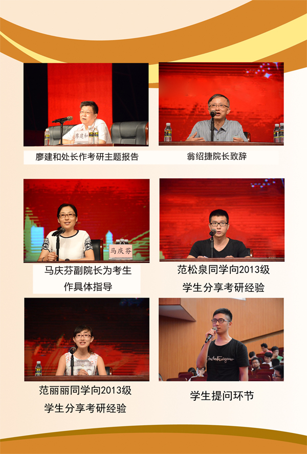2012级范丽丽、范松泉(分别考上吉林大学、湖南大学研究生)向大家分享了自己的考研心路历程。他们认为选择、坚持与真题同等重要,以自身的经历告诫13级的同学们考研之路最重要的是坚持。